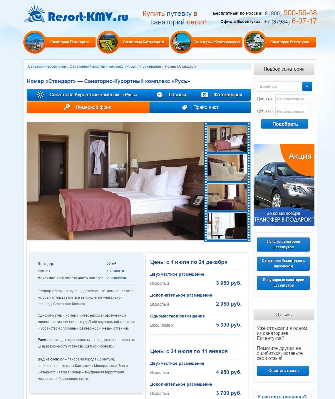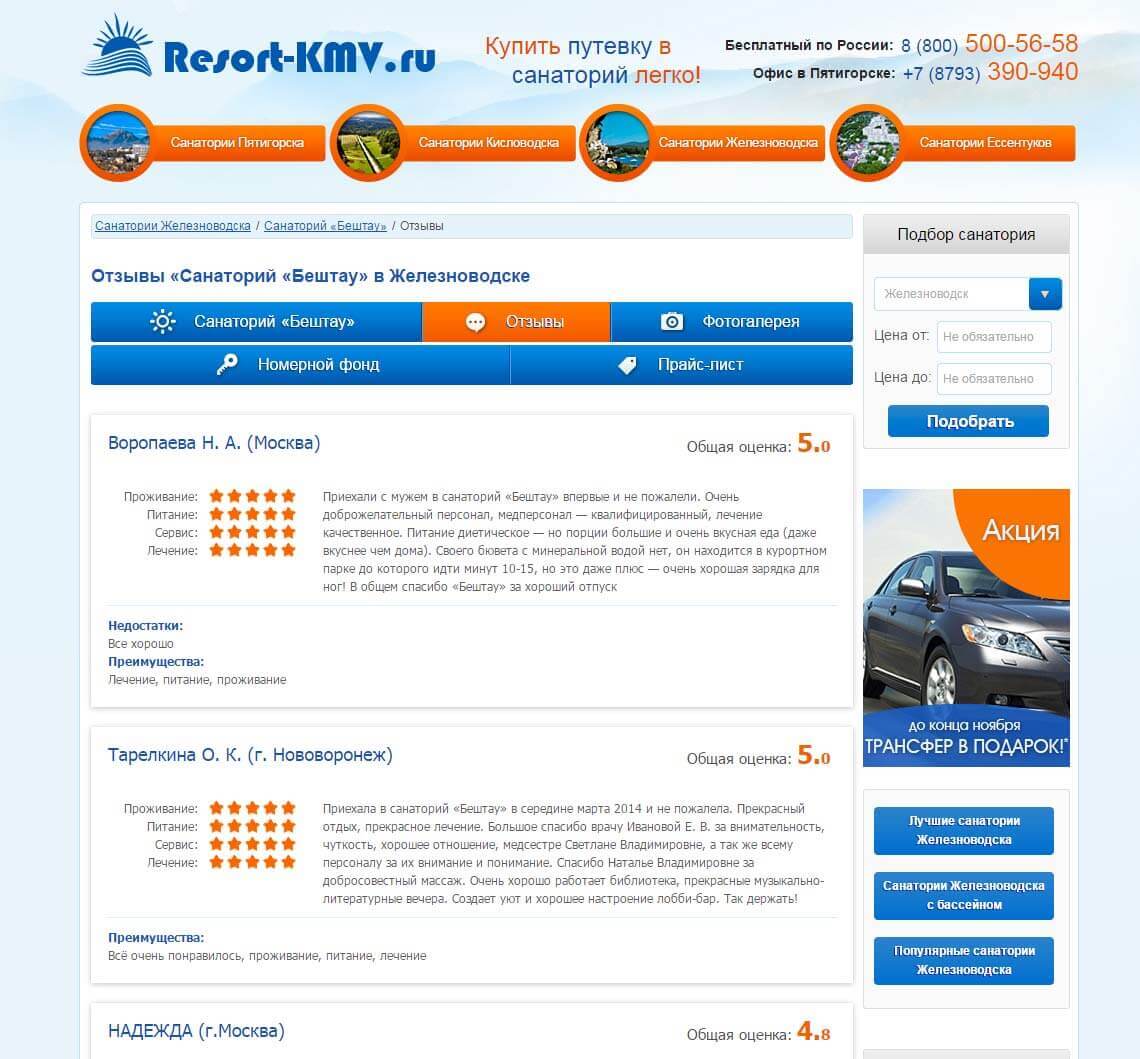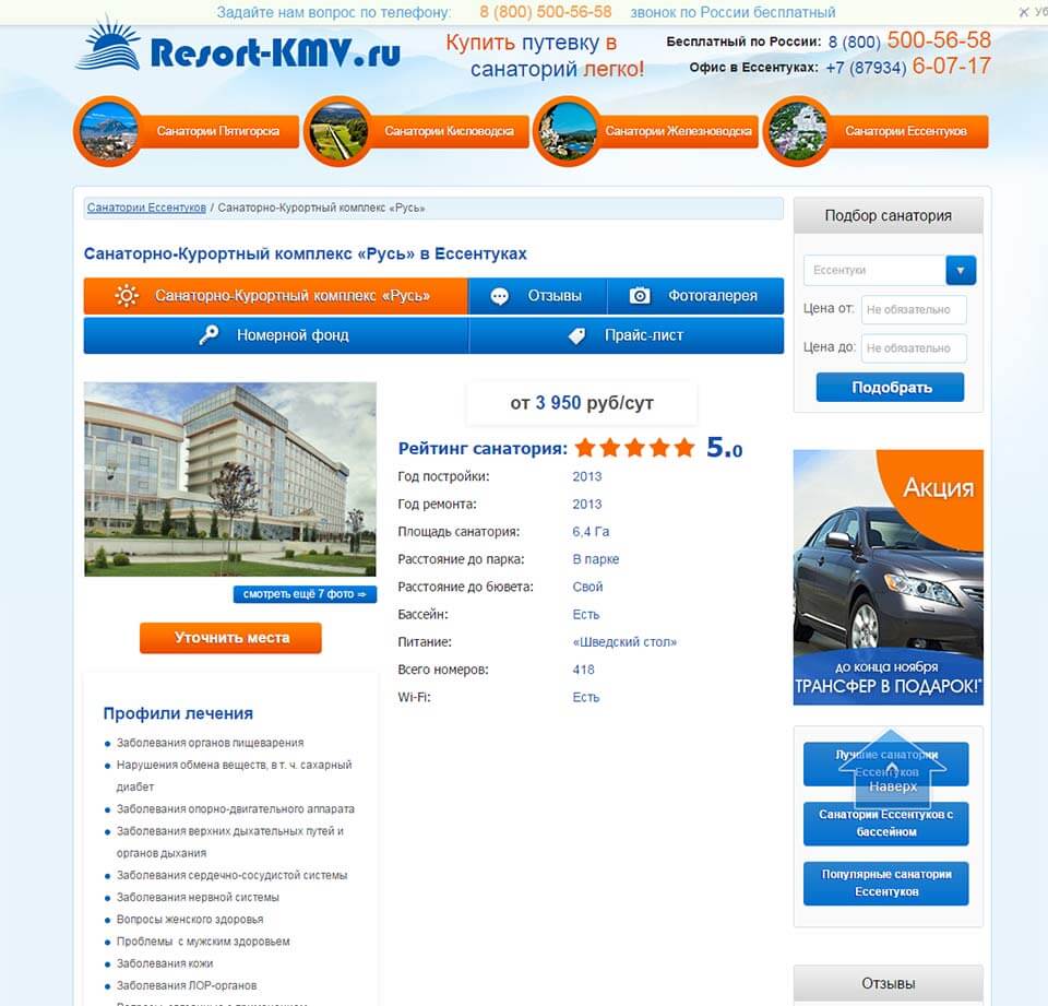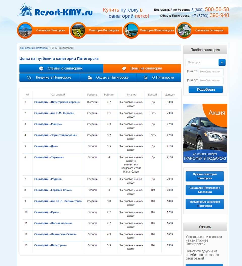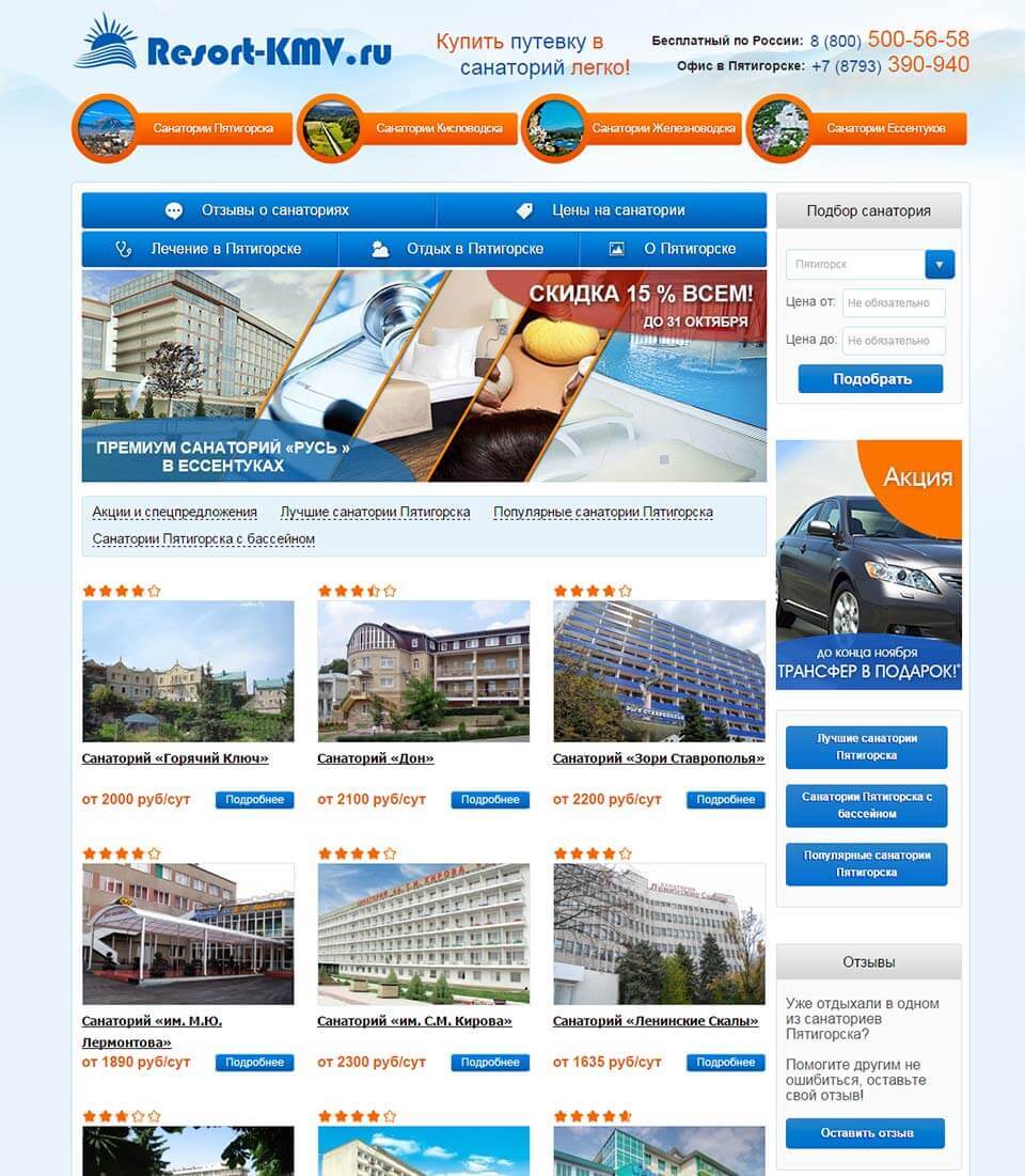 Основная сложность была в объединении фактически 4х сайтов, для каждого города-курорта, прозрачно для пользователя в целях облегчения последующего продвижения в поисковых системах: Yandex и Google. По запросу «санатории КМВ» стабильно находится на верхних позициях.